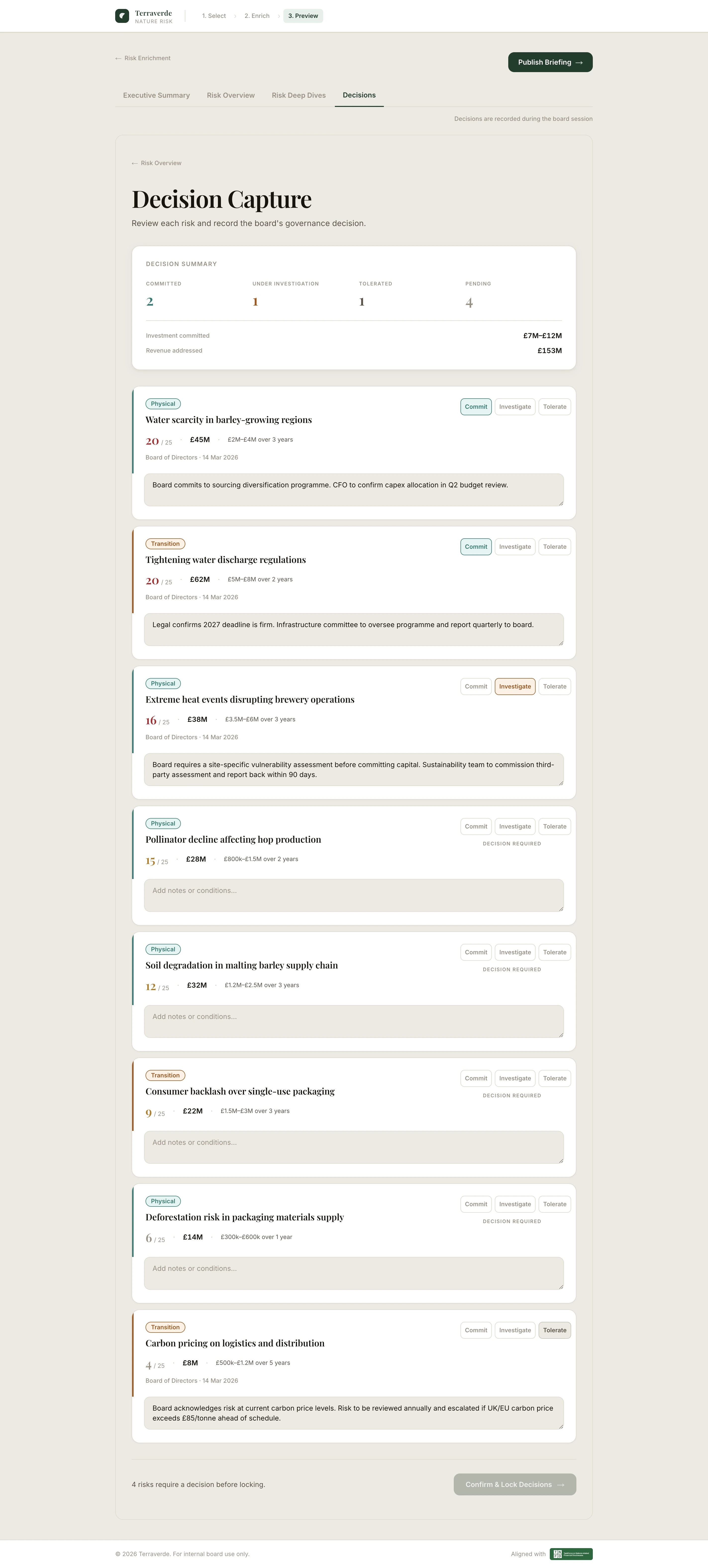Board meetings about nature risk produce discussion. They do not produce decisions. There's no structured mechanism for a board member to say “we approve mitigation on this risk” or “we consciously accept this one.” Under TNFD, companies need recorded, timestamped, attributed decisions. Not “we discussed it.” But nobody has given boards a tool that makes deciding easy.